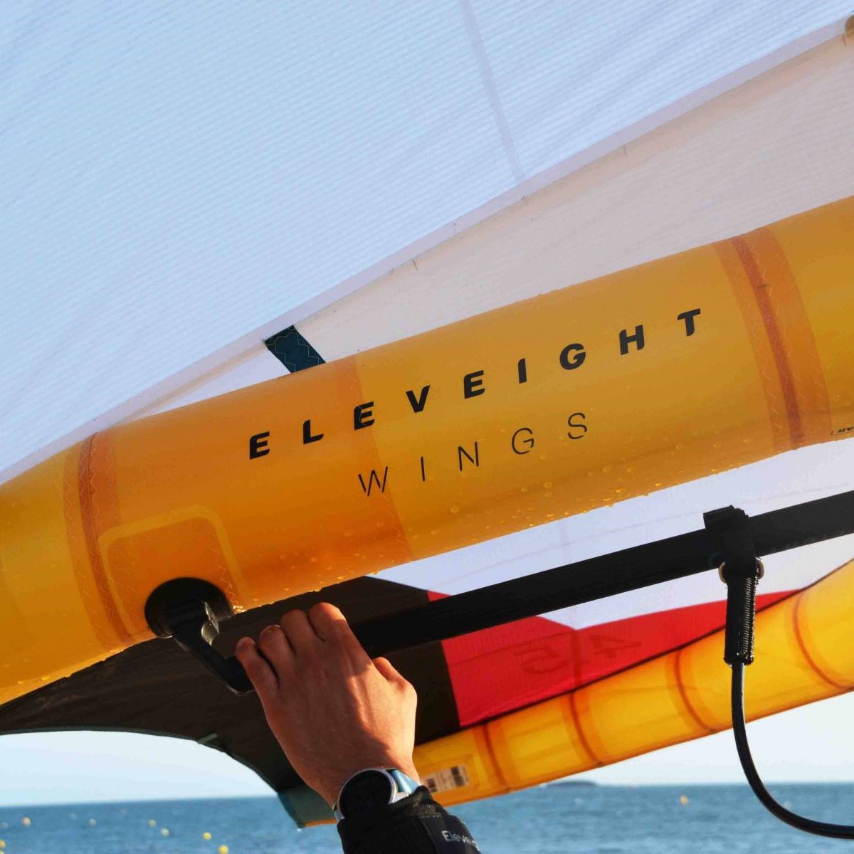 La toute nouvelle Eleveight WFS PRO impressionne dès qu’on la sort du sac (assez grand et très pratique au passage). Son design est moderne et épuré : l’ensemble blanc, noir et jaune avec une touche de rouge se marie parfaitement avec sa construction en Aluula. Une fois gonflée la toile est vraiment tendue, la voile est super légère grâce à son wishbone en carbone et à l’Aluula ce qui la rend hyper stable. Globalement le shape de la voile est compact et intuitif, elle se manie facilement et la puissance se trouve tout de suite.